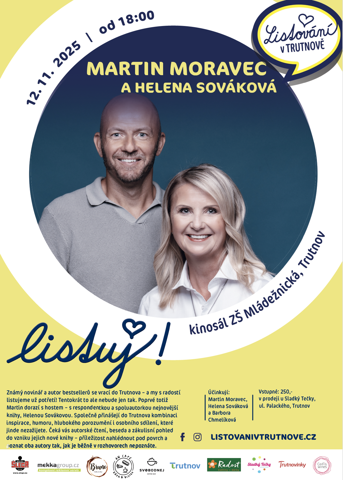 Těšit se můžete na autorské čtení, živou besedu, pohled do zákulisí psaní knih a osobní sdílení, které je pro Martinovy večery typické. Možná se zasmějeme, možná budeme chvíli zticha – ale hlavně budeme poslouchat příběhy, které za to stojí.